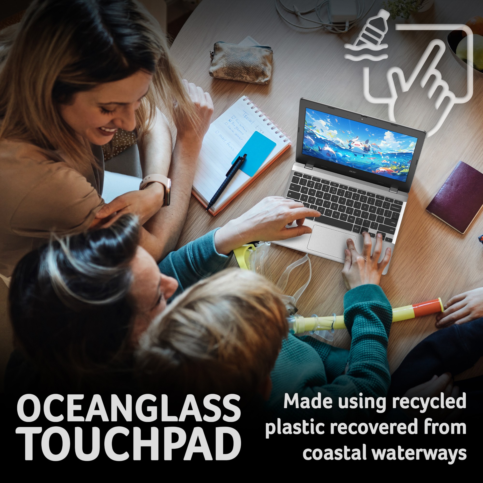 Featuring recycled materials, sustainable packaging, an energy-efficient design, and EPEAT registration3, this Chromebook embodies the spirit of our Earthion initiative to reduce waste and help create a greener future.