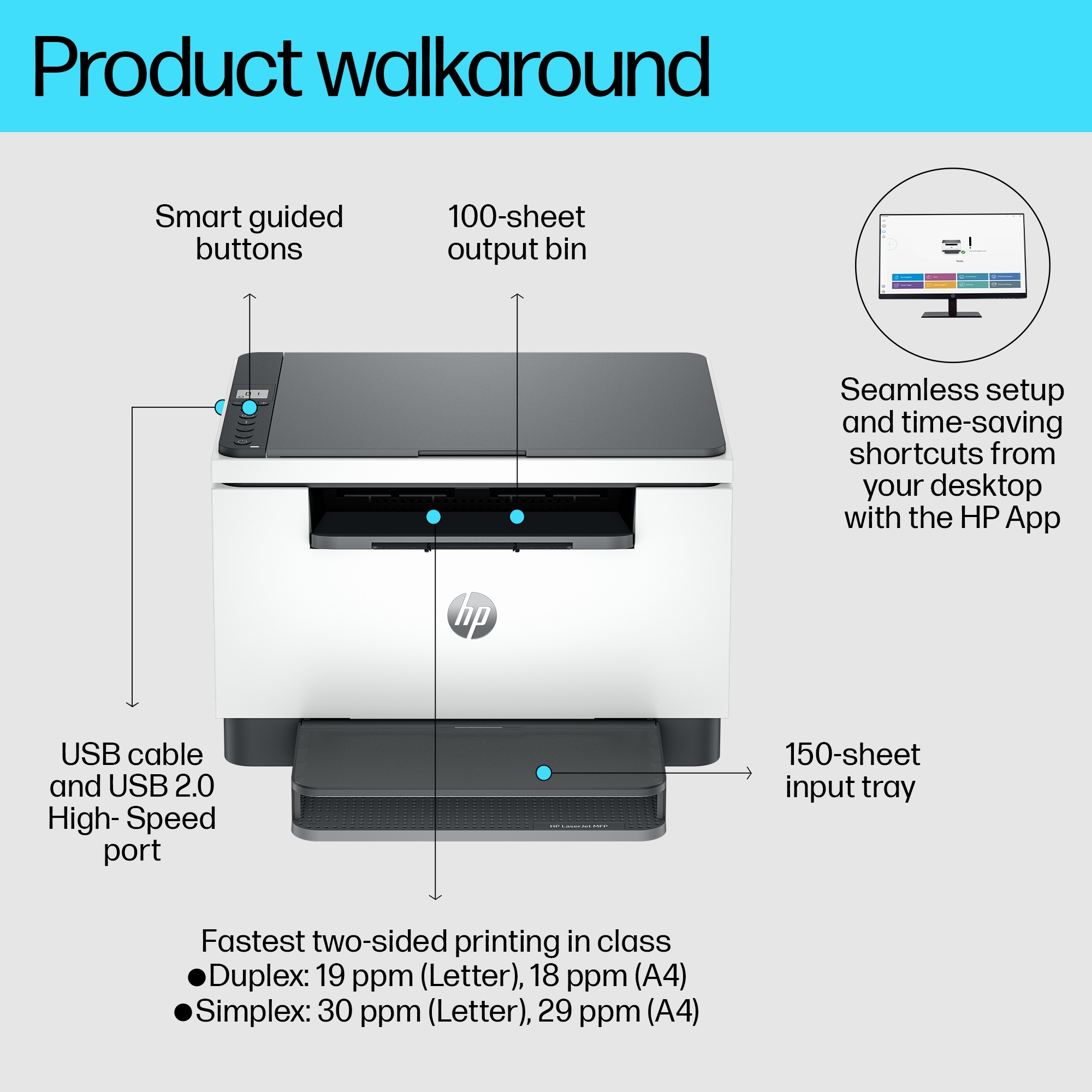 Fast, reliable performance. Exceptional value Increase productivity with this high-performance black-and-white printer in an award-winning compact design.[2] Experience the fastest two-sided printing in class[8] with copying and scanning, plus simplified setup and time-saving features with the HP app.[3]