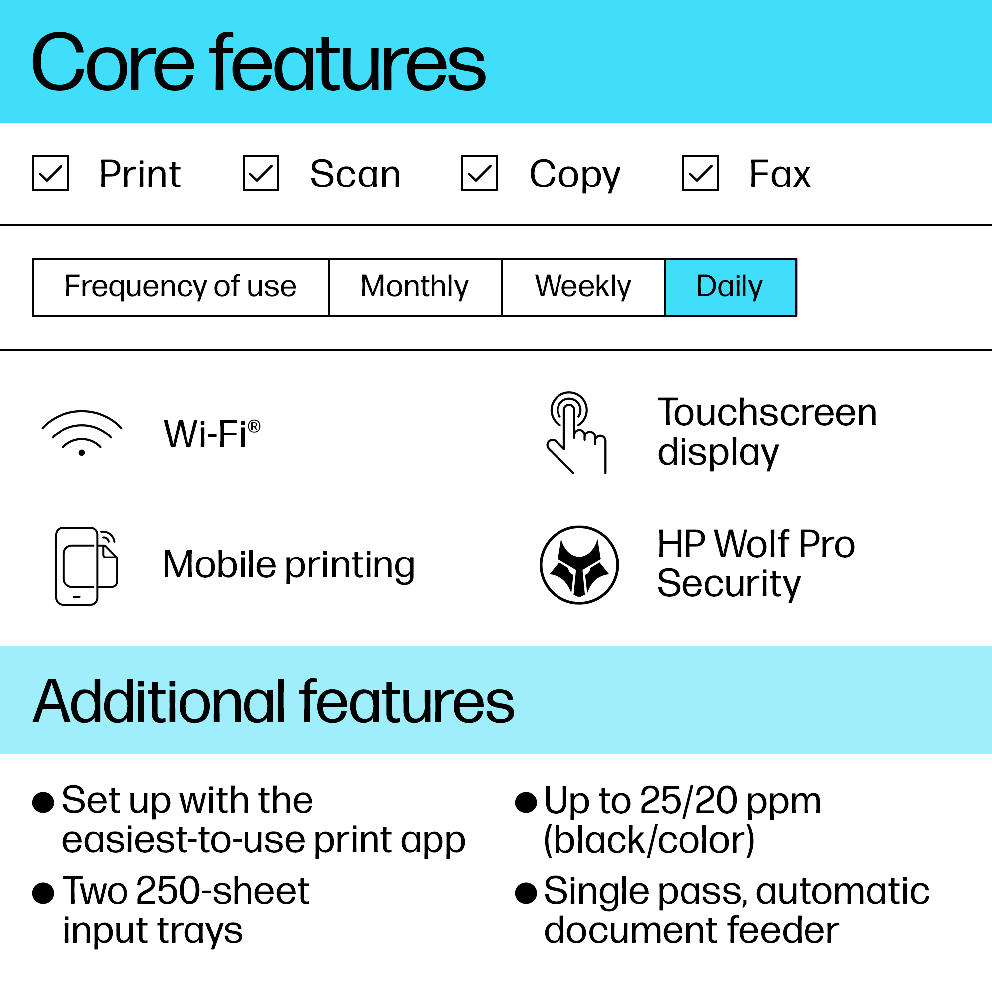 | Print speed (black, normal quality, A4/US Letter) | 25 ppm |