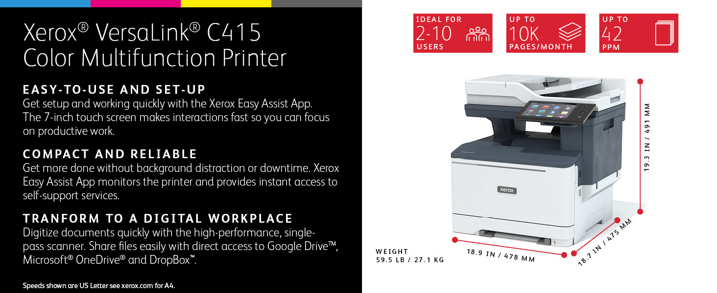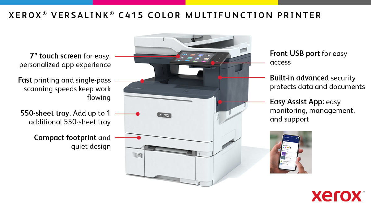 Uncompromising Productivity, Reliability and Security: Your work continues to demand more — greater mobility, better security, and simpler ways of getting more done. That’s why next-level capabilities come standard with the Xerox® VersaLink® C415 Color Multifunction Printer (MFP). Powered by advanced Xerox® ConnectKey® Technology, this modern multifunction printer is ready for anything you throw at it — today or tomorrow. Say Hello to More Ease: Easy-to-follow, step-by-step configuration options make setup a breeze, so you can get up to speed and back to work in minutes, not hours. The Xerox® Easy Assist App simplifies installation, monitoring and management of your MFP from the convenience of your mobile phone. Powering Productivity: The intuitive touch screen interface is your on-ramp to the ever-expanding Xerox App Gallery, home to a wide variety of apps to take your Workplace Assistant even further. This allows the C415 MFP to adjust to the needs of your organization, even the ones you don’t see coming. For example, the Easy Translator Service App can translate scanned documents into several different languages in a snap. Smart, Multi-Layered Security: Even security is simpler with the C415 MFP. Built-in features and comprehensive services that work hard to keep data and documents safe by preventing unauthorized access, detecting suspicious or malicious behavior and staying ahead of threats. Made for Modern, Mobile Work: You’re always on the go, and your Workplace Assistant can help you stay that way. Work when, where and how you want with access to your favorite cloud storage platforms, including Google Drive™, Microsoft® OneDrive® and DropBox™, as well as additional options through the Xerox App Gallery. Wireless flexibility makes it easy to print and stay secure and connected no matter what.